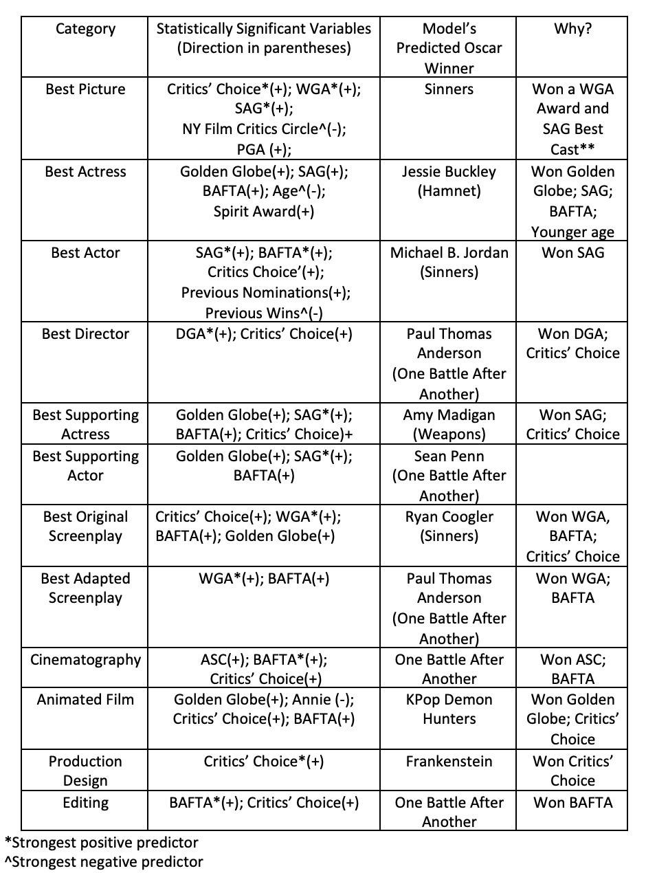 One Battle After Another has won three of the five positively signed significant predictors (PGA, WGA for Adapted Screenplay, and Critics Choice). Sinners have won two (SAG for Best Cast and WGA Award for Original Screenplay).